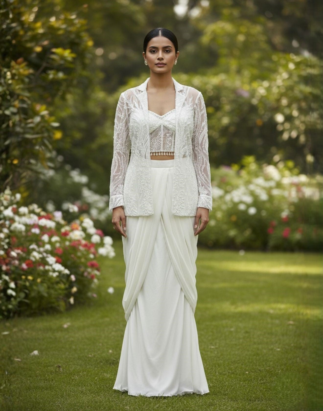 A modern interpretation of timeless elegance, this ivory ensemble blends soft fluidity with refined structure—perfect for cocktail soirées, engagement celebrations, and contemporary festive evenings.