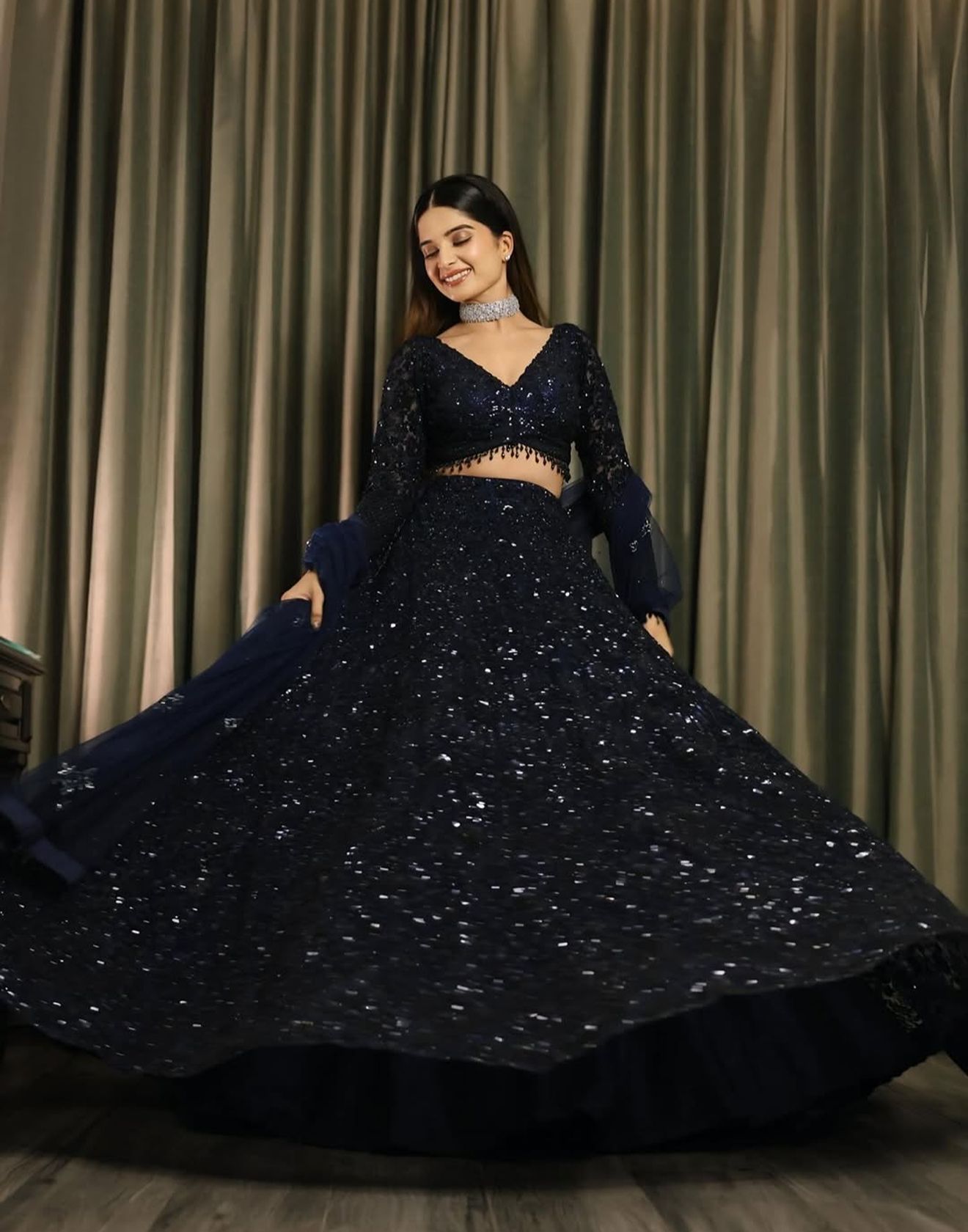 The lehenga is fashioned in delicate net fabric, richly adorned with all-over sequin embroidery that creates a starry-night effect with every twirl.