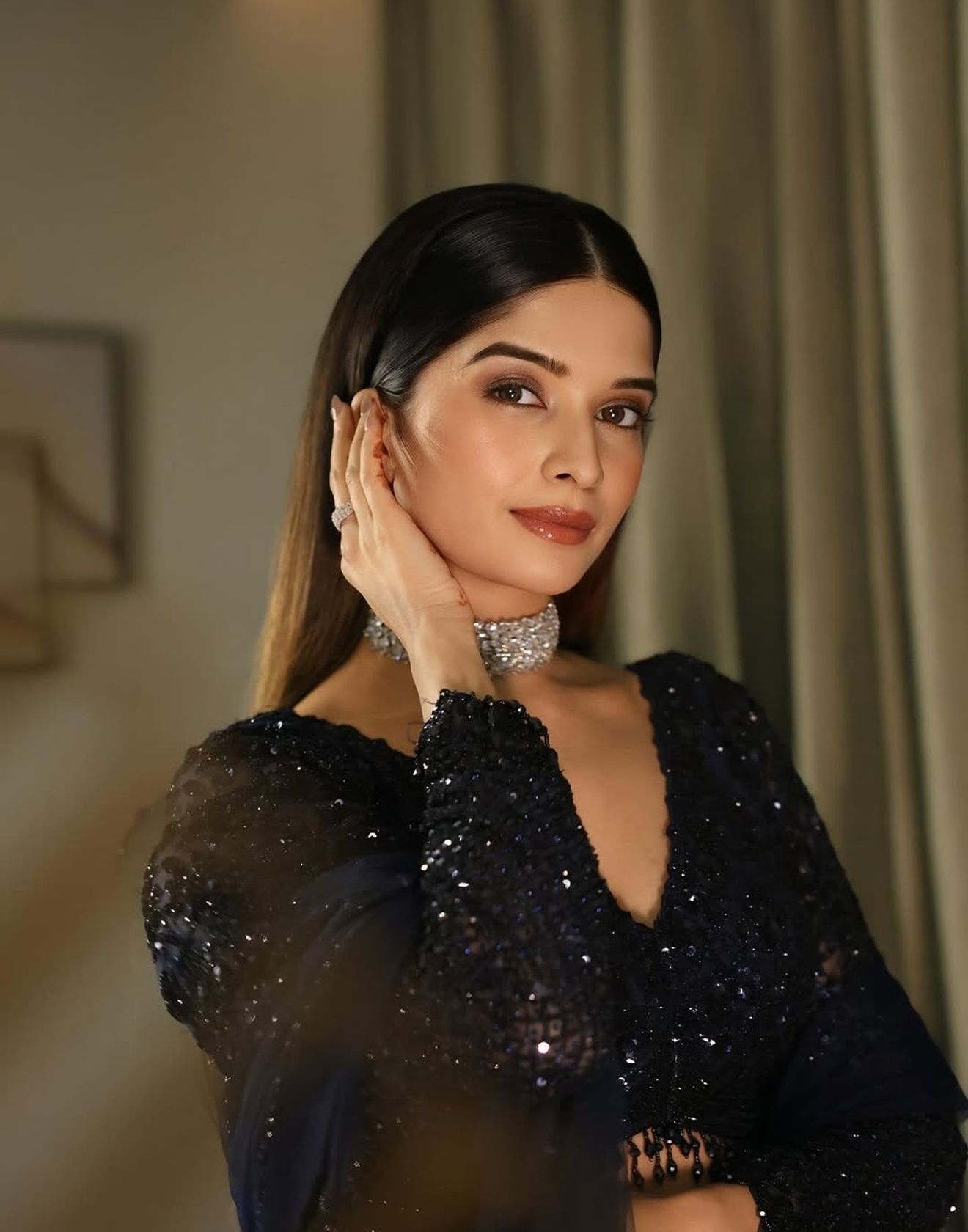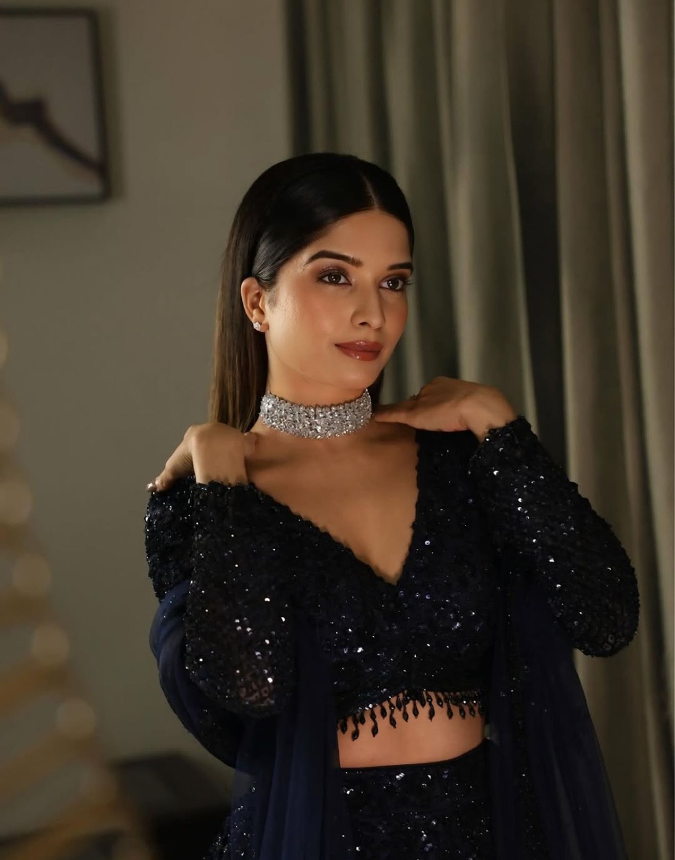 Crafted for after-dark glamour, this ensemble captures the allure of movement, shimmer, and timeless sophistication.